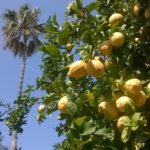 Ella néni megmutatta a kertjét (valahogy Judit mama jutott róla eszembe… bőven 80-an felett, de tip-top az egész, egy szál gaz nincs, babusgatja a virágokat…), ahol van egy hatalmas citromfa is, néhol másfél öklömnyi citromokkal. Ami vagy ott rohad meg, mert magasan van, vagy lepotyog, mi is elhoztunk egy zacskóval most, de így is rengeteg van… Meg kaptam a mellette lévő narancsfáról virágot, és most már értem, hogy honnan jön az iparba a citrus illatú wc-spray-k alaparomája… Arrébb is kellett tennem az asztalról, amikor ebédeltem, mert a szabad asszociáció dolgozott…