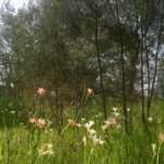 A száraz, bozótos részen kicsit, alacsony, de nagyon színes virágok, lila, fehér, narancssárga… a vizenyős-mocsaras részen meg volt egy-két folt, ahol fehér kála nőtt. Csak úgy. Meg volt ott is hosszú lógó rózsaszín, hosszú nem lógó rózsaszín, hatszirmú fehér-lila, meg egy nagyon érdekes valami, aminek nagyon élénk színei voltak, és úgy nézett ki, mintha plüss lenne. Megsimogattam, nem bökött meg, nem volt mérges se, úgyhogy x. Meg találtam egy papírfát. Azt hiszem tényleg így is hívják. Tök puha volt az egész. És rétegekben le lehetett (volna) szedni a kérgét. Amit tényleg úgy hajtottam, mint egy vékony karton szerűséget. És még a legrégebbi, legalsó réteg is puha volt…. Durva. Nem is értem, hogy hogy van ez még egyáltalán életben és nő meg háromméteresre 😀