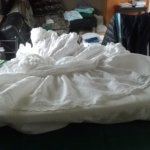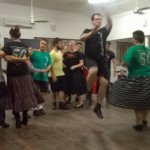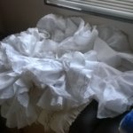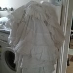 Tegnap kivasaltam az alsószoknyámat – röpke 4 óra volt tisztán. Közte tartottam egy ebédszünetet, de így is lezsibbadt a vállam meg a csuklóm mire végeztem. Meg nem mondom nektek hány réteg anyag, így-úgy egymásra varrva, fordosan, egyenesen, toldva, anélkül… És ezeket szépen bevizezni, kiegyengetni, átvasalni… Azt hittem sose végzek. Este meg maratoni próbánk volt a Keszkenővel, fél 7-től kezdve kb fél 11-ig toltuk nagyjából szünet nélkül, utána még egyeztetés, szervezkedés, úgyhogy éjfél volt mire hazaértünk. De most már legalább – én legalábbis – kezdek átlátni a káoszon, kezdem érteni a szatmári részeit, meg ezeknek az egymásutánját, meg hogy ezekben hol-mit-kivel kell csinálnom.