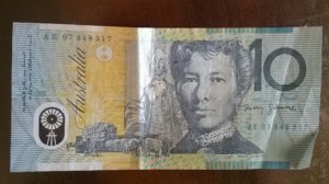 Hátoldalán egy szintén író, költő néni, aki országszerte tett az ausztrál irodalomért. Mellette az aláírása, az ablak pedig egy szélmalom.