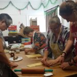 Végülis több, mint egy és negyed óra után, úgy fél 11 magasságában be is értem a magyar házba. Szerencsére innen nem nagyon lehet elkésni, a többség már bent volt, de utánam is még bőven szállingóztak az emberek segíteni. Mert hogy továbbra is ipari mennyiségű karácsonyi süteménysütés van, ma megcsináltunk 272 db bejglit a tegnapi gombócokból. A végére már nagyon szépen és gyorsan ment nekem is téglalap alakúra nyújtanom a tésztát. Jó, persze előtte Aranka elárulta, megmutatta a nagy titkot, hogy hogyan kell, mert korábban inkább szép kör alakú pizzára hasonlított az eredmény…